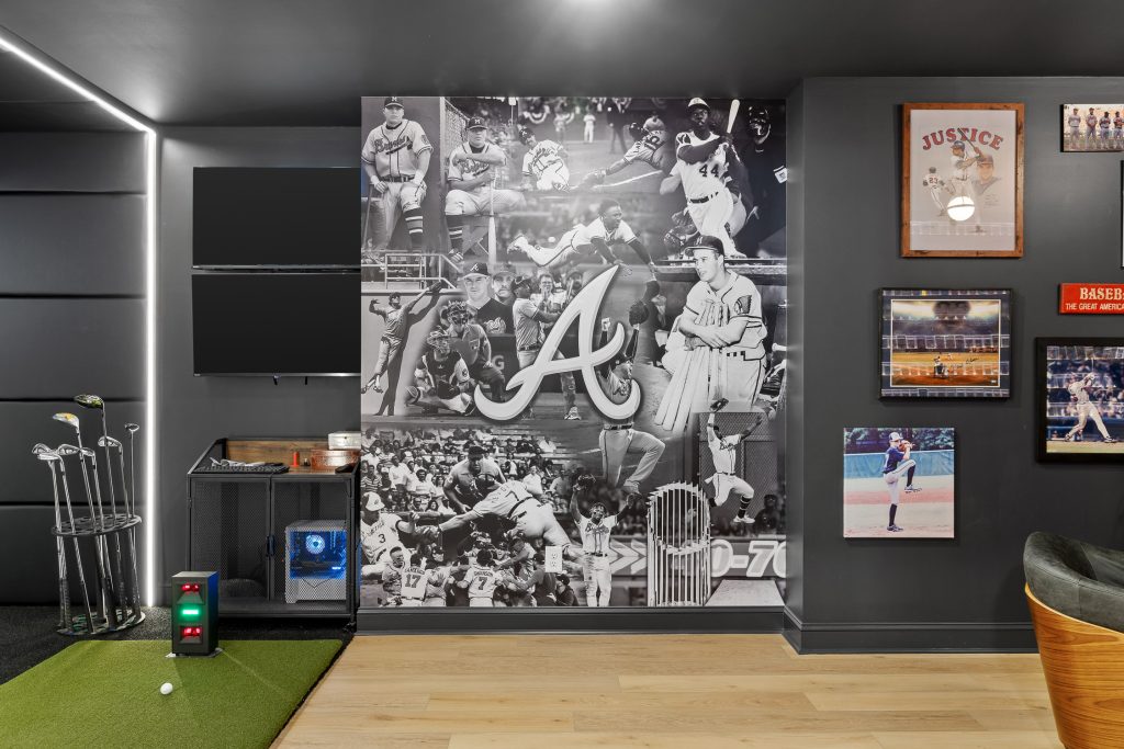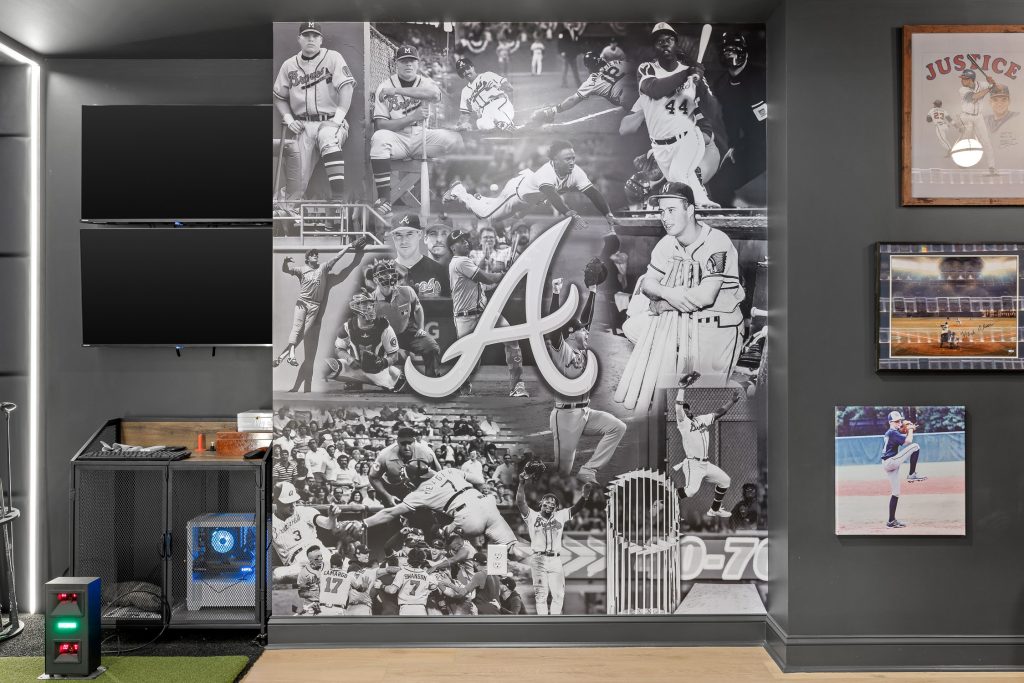 This Braves-themed custom basement proves that luxury and fun don’t have to compete—they can coexist beautifully. From the custom bar and convertible pool table to the golf simulator and eight-TV setup, every detail was designed with intention, craftsmanship, and Atlanta pride.