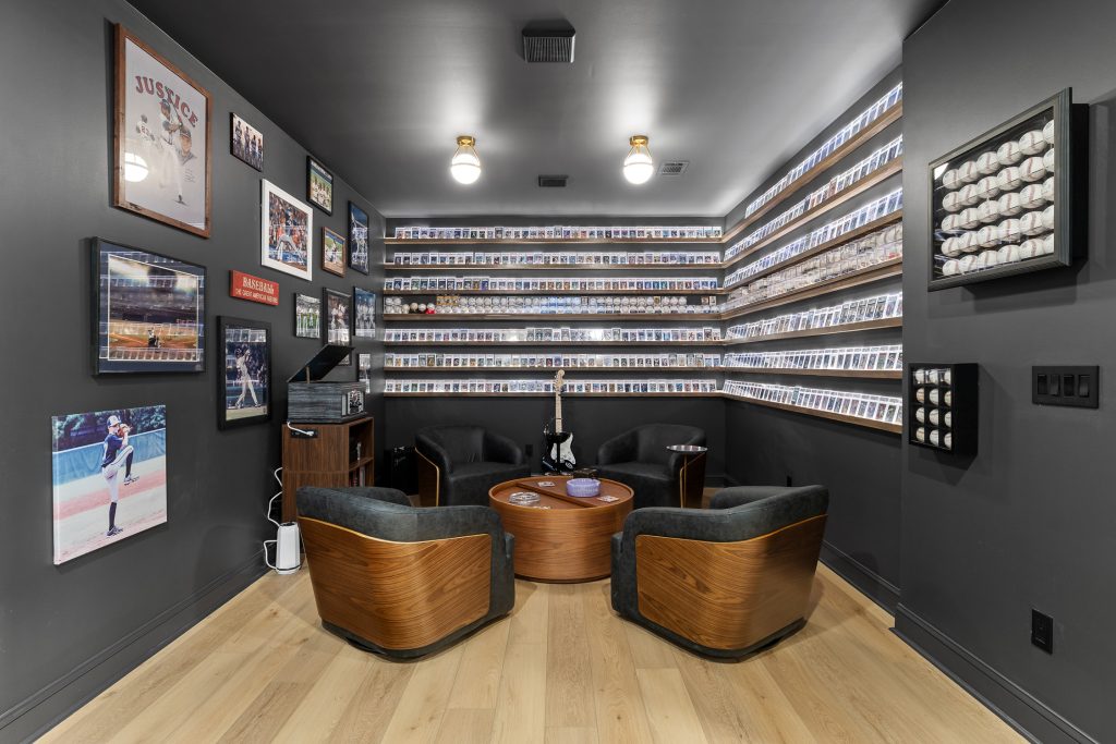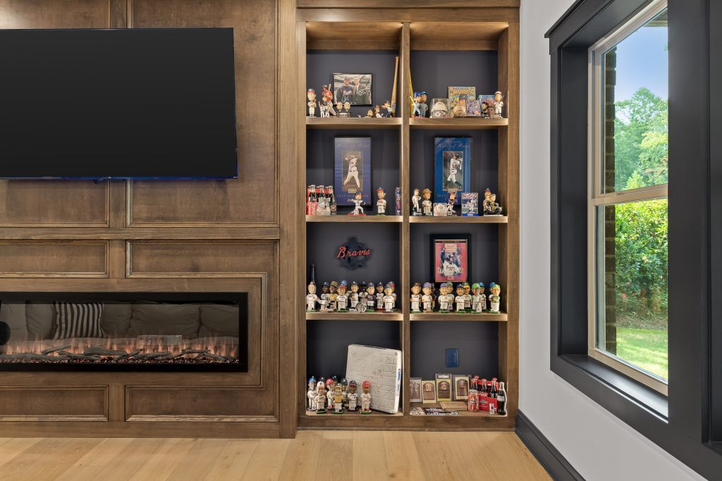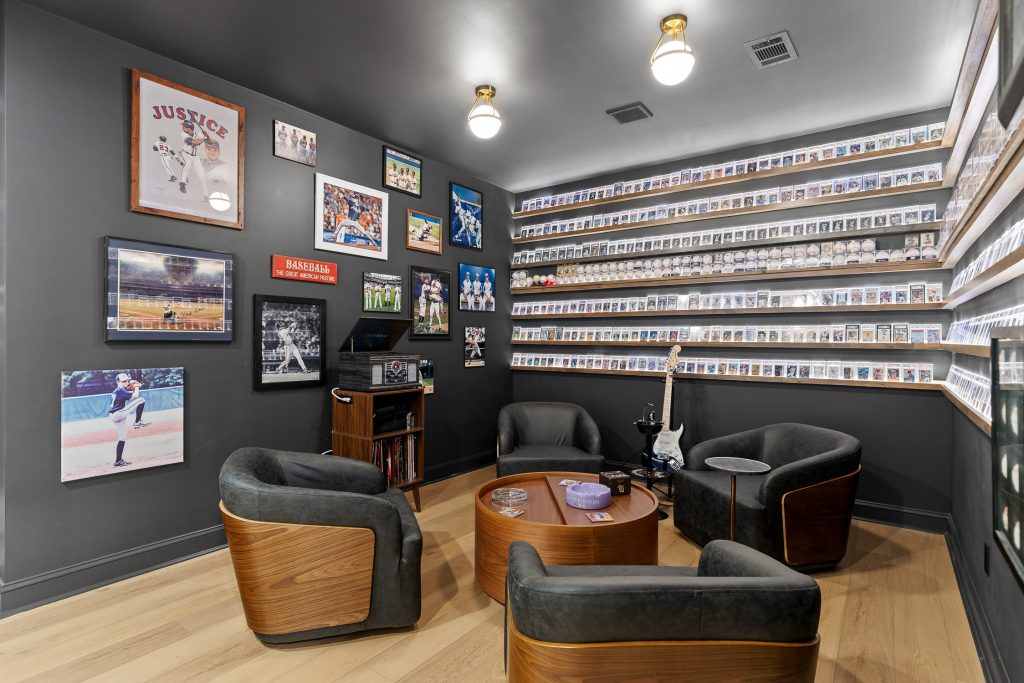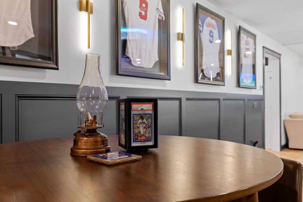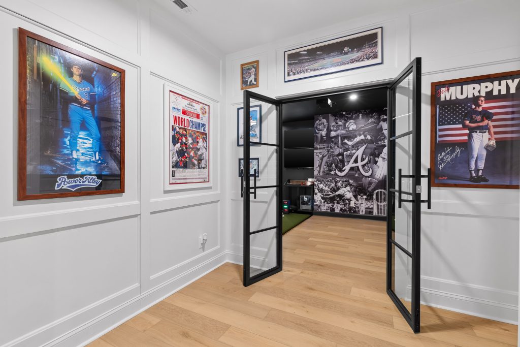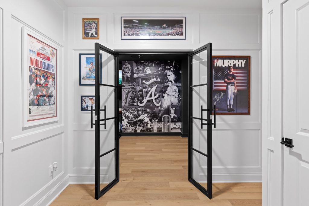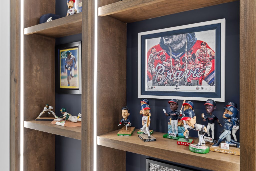 From the moment you step downstairs, the space makes its intentions clear: this basement was designed for fans. A cohesive sports theme pays homage to the hometown heroes, the Atlanta Braves, without tipping into gimmicky territory. Instead, subtle team colors, premium finishes, framed memorabilia, and accent lighting create a polished, upscale environment that still delivers plenty of game-day energy.