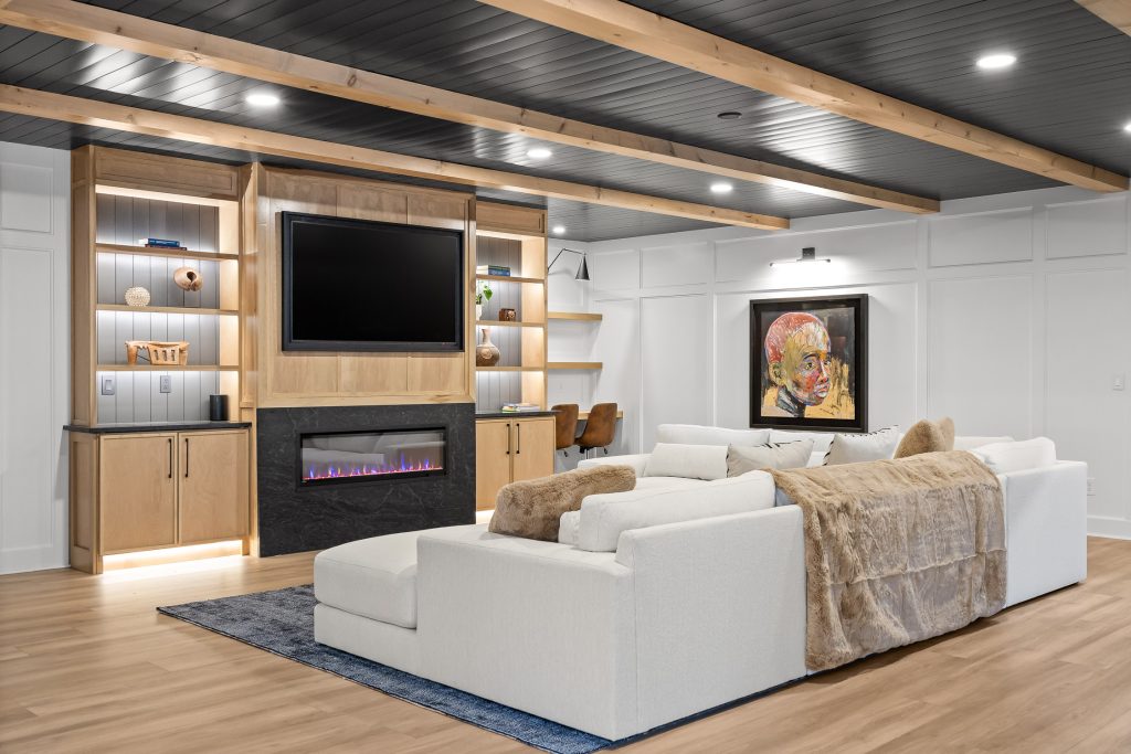 The entertainment lounge features wide plank wood flooring that adds warmth and durability while complementing the modern design throughout the basement. One of the focal points of the space is the custom-built entertainment wall, which includes built-in cabinetry, floating shelves, and integrated lighting that highlights decorative elements while creating a sophisticated visual centerpiece.